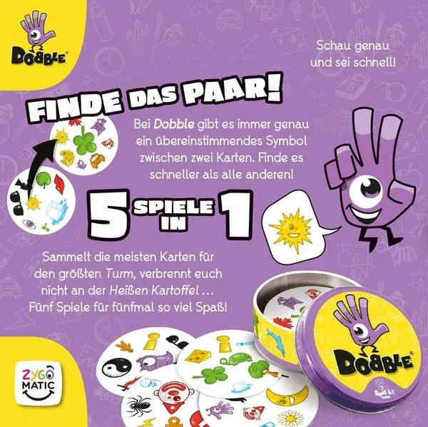 Dobble ist ein kartenbasiertes Party- und Reaktionsspiel mit fünf verschiedenen Spielvarianten. Wer entdeckt als Erster die zwei identischen Symbole? Hört sich einfach an – ist es aber nicht. Auf einmal scheint ein kleiner grüner Dinosaurier ganz anders auszusehen als ein großer. Dobble wird nachhaltiger, um unseren Planeten zu erhalten. Mit weniger Plastik und Papier aus nachhaltiger Waldwirtschaft.